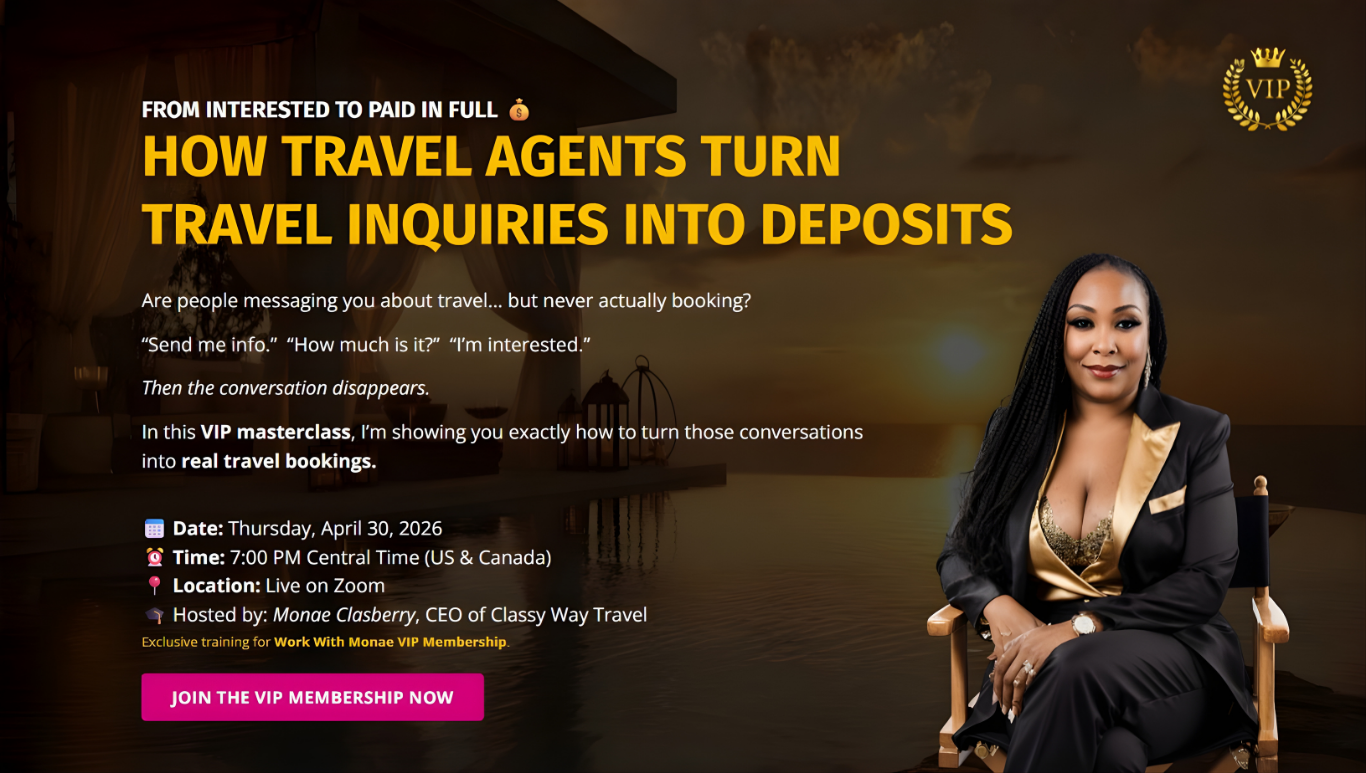 You’re one step away from learning how to turn travel inquiries into real bookings and paid deposits — not conversations that go nowhere.